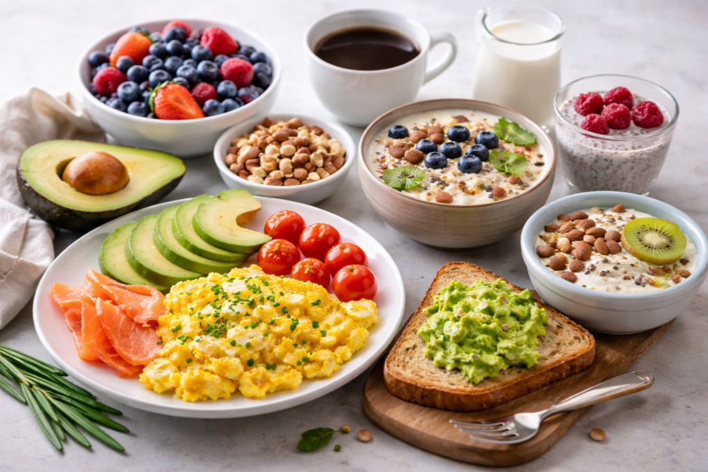 Eggs, avocado, cheese, nuts; no juice/white bread. Cuts breakfast and 24‑h glucose excursions and variability vs guideline high‑carb breakfast (Chang et al., 2019; Oliveira et al., 2023).
